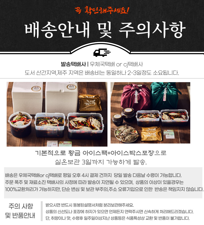 보관방법 또는 취급방법 1. 게장을 받으신 후 하루 ~ 이틀 숙성해 드시면 더 맛있습니다. 2. 간장게장에 계란, 김가루, 참기름 등을 넣어 드시면 더 맛있습니다. 3. 간장게장에 매운고추를 넣어 매콤하게 드시면 더 맛있습니다. 4. 게장을 더 오래, 짜지 않게, 보관하고 싶으면 물건을 받으신 후에 게와 장을 분리하여 게는 냉동, 간장은 냉장보관하여 드시기 30분에 꺼내 드시면 더 오래, 더 신선하게 드실 수 있습니다.